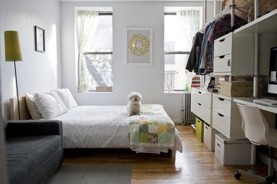 If you live in a small one-bedroom or an efficiency, any piece of furniture represents a big investment in floor space. You can solve this problem by selecting furniture that’s modular and portable. For example, a set of shelves or file baskets with wheels can be pushed back against the wall or into a closet when not in use. A lap desk or this creative armrest-shelf offer surface space without bulk. A convertible futon can serve as bed and couch. A hanging desk can be lifted up to a vertical position to free up floor space. Whatever your layout, you can find a flexible and creative furniture setup to fit your apartment.